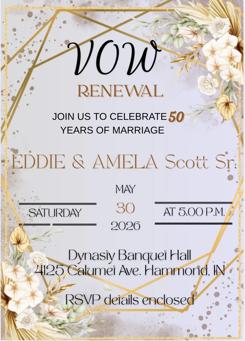 On May 29th, 1976, Eddie Scott & Amela Givens stood before God and entered a covenant of love. A love that has shaped not only their lives, but the lives of so many connected throughout the years. Through every season, their Love has been anchored in faith and strengthened by their commitment to God and the sanctity of their vows. Eddie & Amela’s marriage has been an example of what scripture means when it says, “Love is patient, love is kind… It bears all things, believes all things, hopes all things, endures all things. Love never fails” (1 Corinthians 13:4, 7–8).